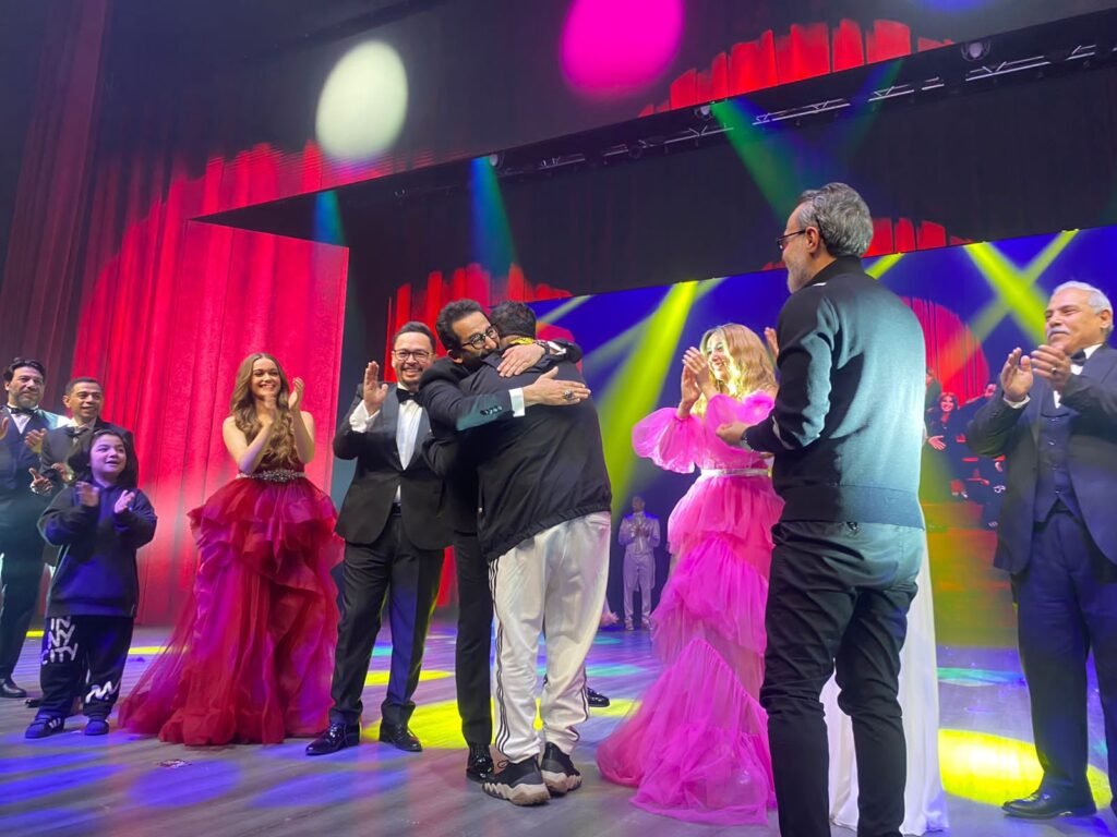 و الجدير بالذكر أن فؤاد قد فوجئ بنزول حلمي من علي خشبة المسرح ليأخذ فؤاد من يده ليعتلي المسرح و يحي الجمهور السعودي معه و مع أبطال العمل و هو ما أصاب فؤاد بالارتباك و التوتر لأنه لم يكن مستعداً لصعود المسرح و حاول الأكتفاء بإرسال تحيته الحارة مصفقا إلي حلمي إلا أن حلمي أصر علي صعود فؤاد معه إلي المسرح وسط احتفاء كبير من الجمهور السعودي لما يتمتع به فؤاد من جماهيرية كبيرة لدي الجمهور السعودي..حيث يذكر أن أول فيديو كليب يذاع علي شاشات التليفزيون السعودي سابقا كان أغنية الحب الحقيقي للفنان محمد فؤادم الرياض..و جاء ذلك أثناء تواجد فؤاد بالسعودية ..و قد أشاد فؤاد بجودة العرض و عبقرية الموضوع و الإخراج و أداء الممثلين و علي رأسهم النجم أحمد حلمي..