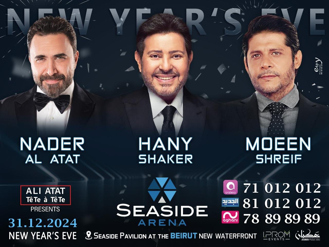 يشهد لبنان ليلة رأس السنة احتفالاً كبيراً، حيث يجمع Seaside Arena نخبة من ألمع نجوم الطرب العربي في حفلٍ من المتوقع أن يكون الأبرز والأكثر إثارة. سيحيي الحفل كل من الفنان القدير هاني شاكر، الصوت الشاب المميز نادر الأتات، والفنان الرومانسي معين شريف، وذلك في ليلة لا تُنسى مليئة بالموسيقى والأجواء الاحتفالية.