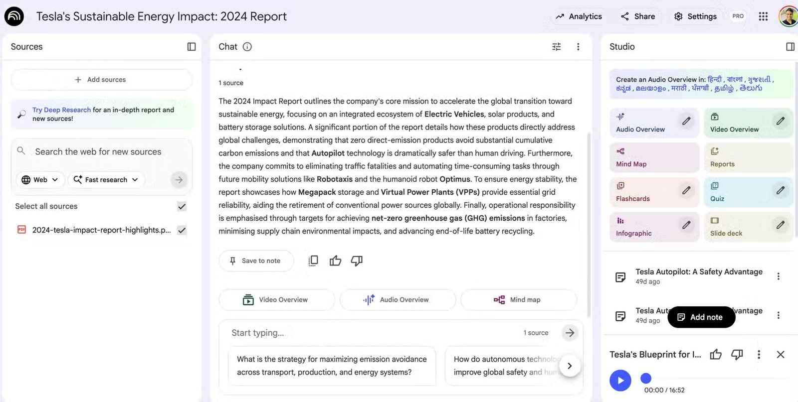 لقد قمت بإدخال ملف PDF بالكامل في NotebookLM، وضغطت على تشغيل، وفي غضون دقائق، حصلت على ملخص صوتي واضح يسلط الضوء على التوفير المحدد في انبعاثات ثاني أكسيد الكربون من أسطولهم في عام 2023 مقارنة بالعام السابق، وتفاصيل ميجاوات/ساعة المخزنة عبر قطاعات Powerwall وMegapack، والتحول الاستراتيجي الرئيسي نحو الاستفادة من أقسام الذكاء الاصطناعي والروبوتات لتحقيق كفاءة التصنيع.
