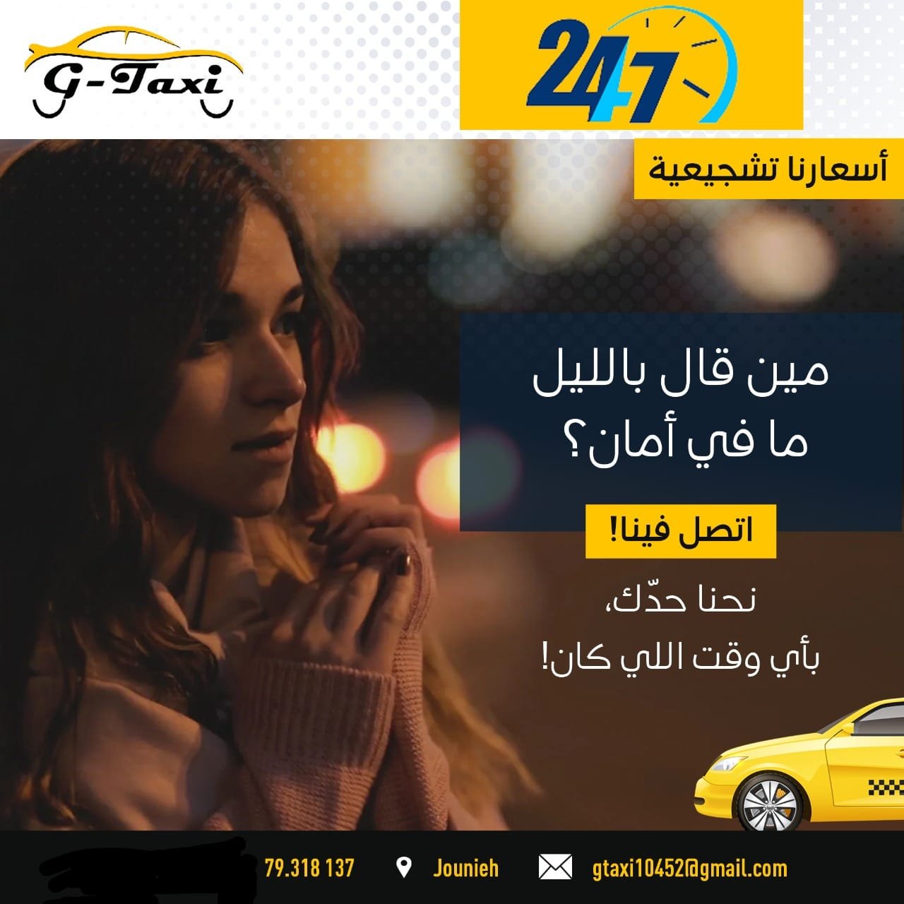 تحت هذا الشعار يمكننا أن نؤكد لكم بأن وسيلة النقل لراحتكم وامانكم هي واحدة في لبنان وعلى مدار ٢٤ ساعة ، g.taxi يتنقل بك الى اي منطقة في لبنان ، دون اي قلق ، شعار جي تكسي هو مين قال ما في بالليل أمان ، جرب وتحقق بنفسك