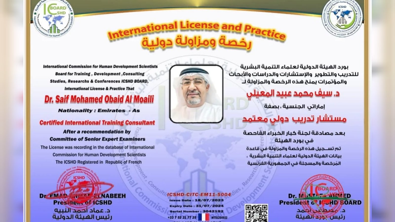 هيئة دولية بفرنسا تمنح المدرب الاماراتي د سيف المعيلي اعتماد كمستشار دولي معتمد