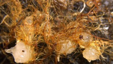 صورة مقربة لشتلات Cremastra variabilis (بيضاء) متشابكة مع خيوط فطرية بالقرب من الخشب المتحلل، مما يوضح كيف تحافظ الفطريات المتحللة…
